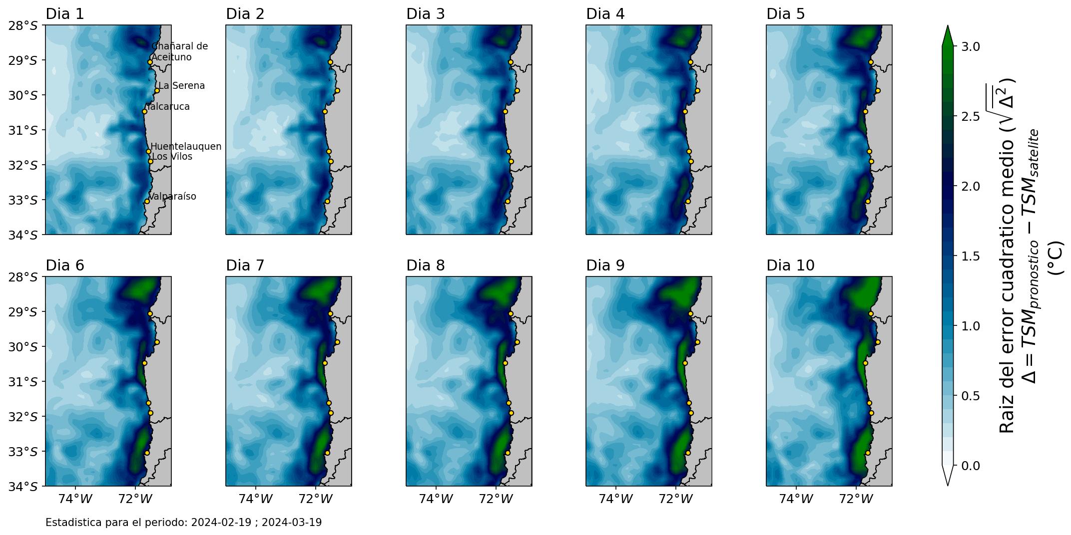 El mapa regional presenta el error promedio de los pronósticos diarios de TSM en relación a las mediciones satelitales durante los últimos dos meses de predicciones. Note que áreas con valores menores y mayores sólo indican un mejor o peor desempeño, respectivamente, sin precisar si el error corresponde a una sobre o subestimación.