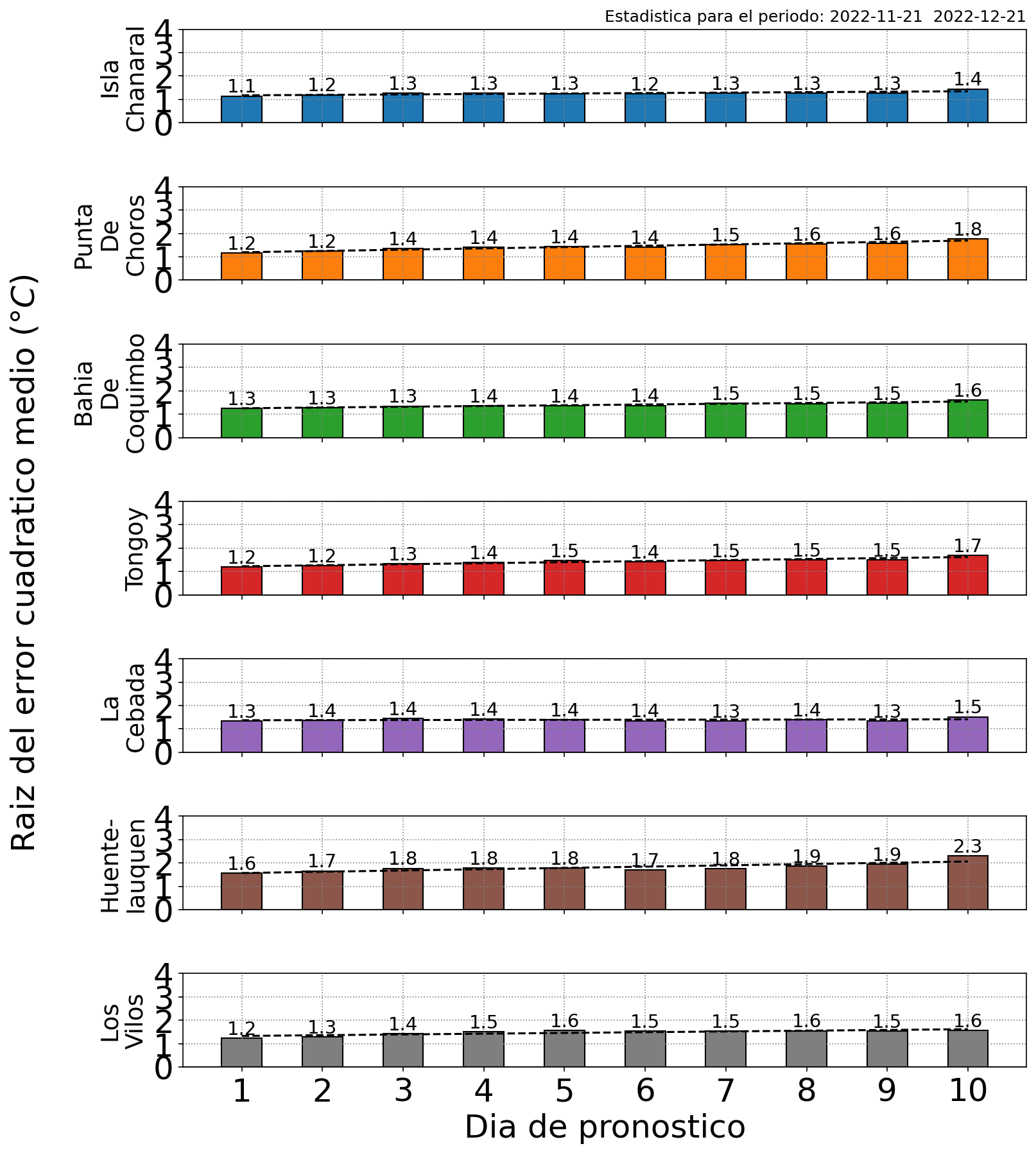 Los gráficos de barras presentan el error promedio de los pronósticos diarios de TSM para cada una de las localidades costeras en análisis. La estadística se construye en base a las mediciones satelitales de los últimos dos meses de predicciones.