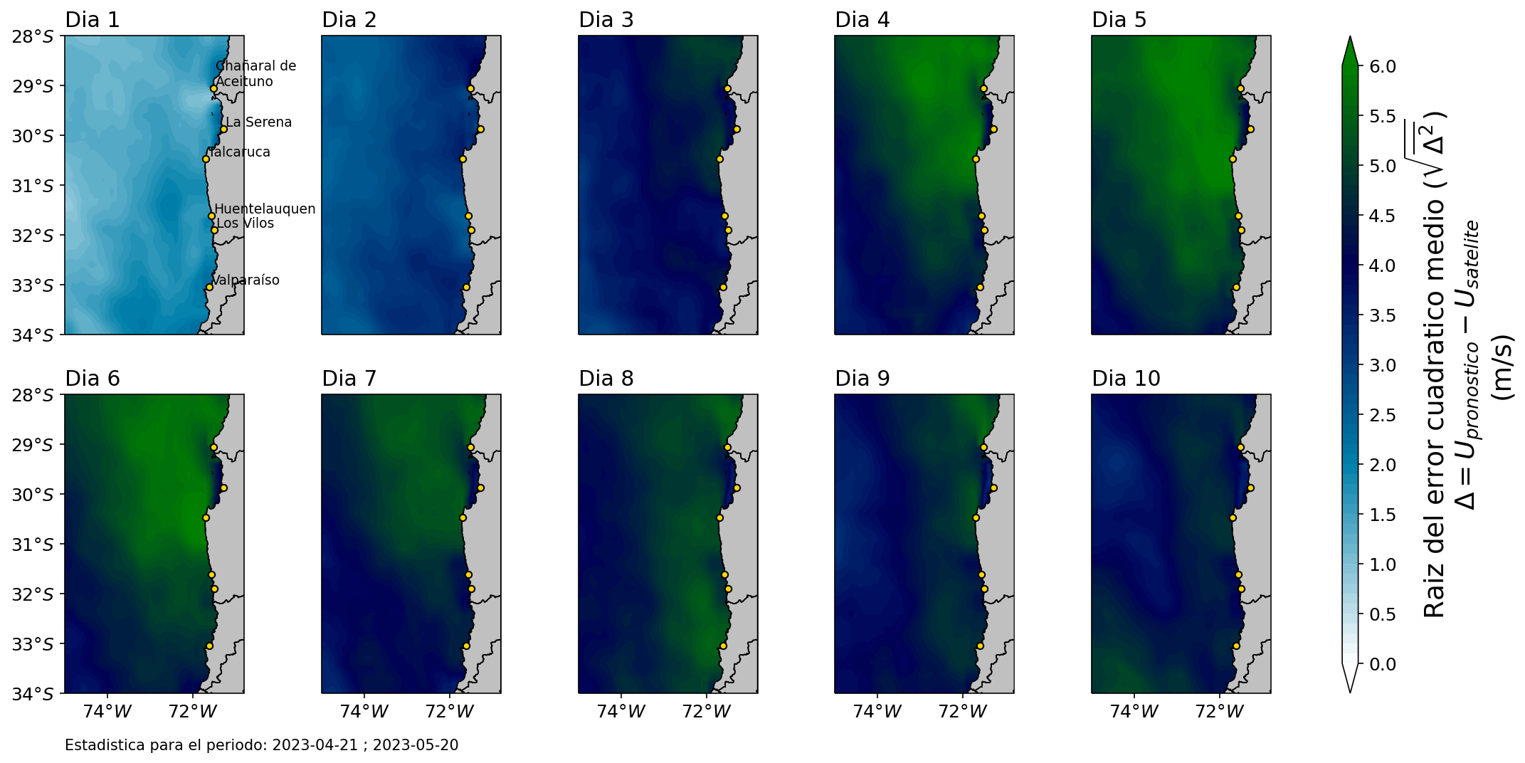 El mapa regional presenta el error promedio de los pronósticos diarios de viento a 10 metros en relación a las mediciones satelitales durante los últimos dos meses de predicciones. Note que áreas con valores menores y mayores sólo indican un mejor o peor desempeño, respectivamente, sin precisar si el error corresponde a una sobre o subestimación.