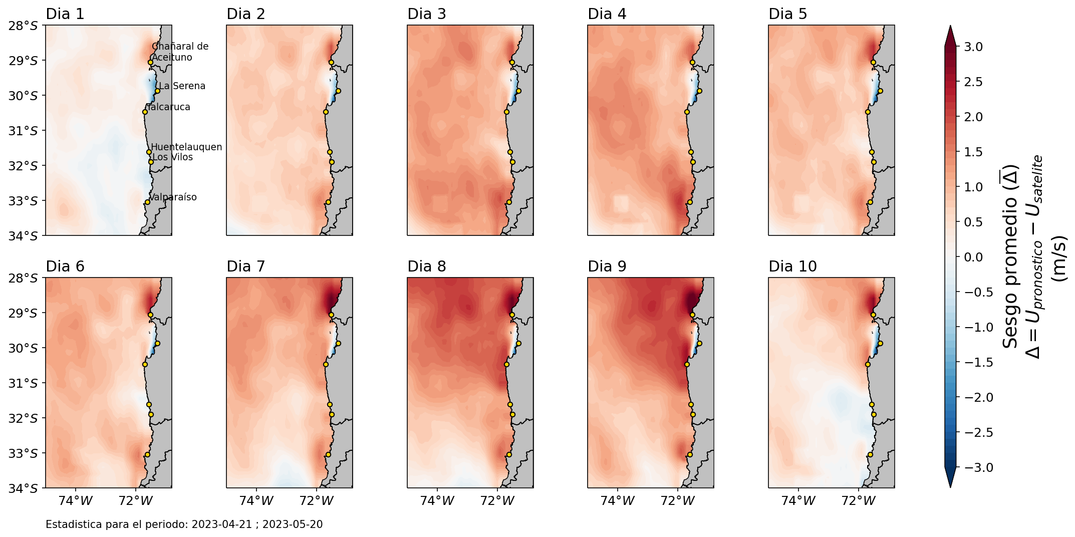 Sesgo diario del pronóstico de viento a 10 metros para la región de Coquimbo