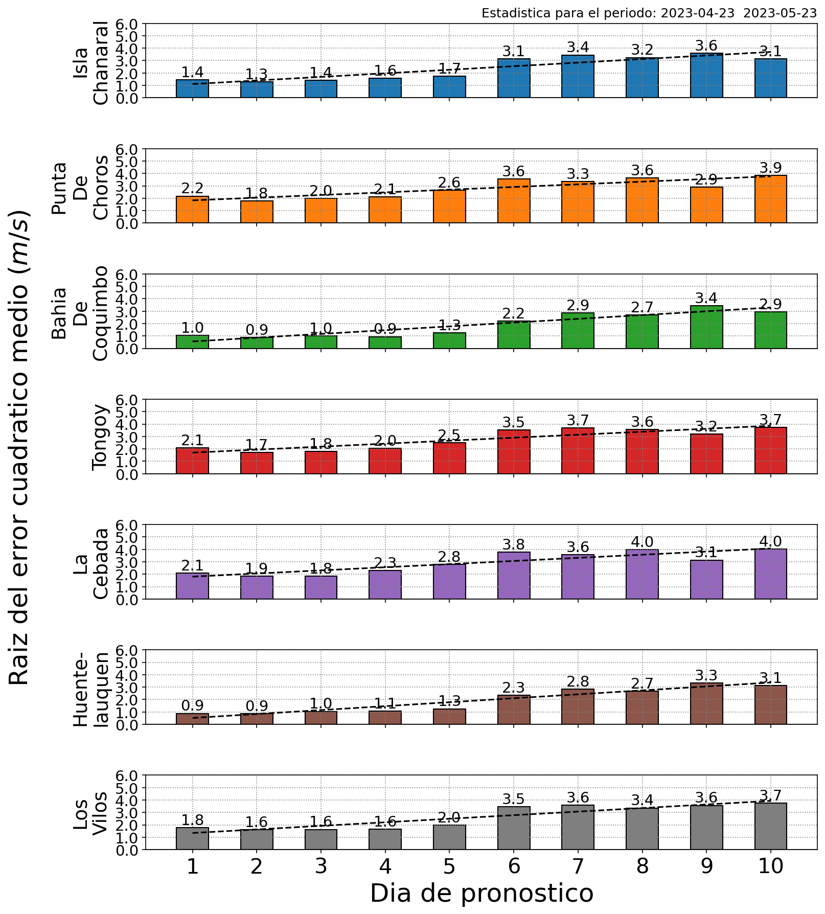 Los gráficos de barras presentan el error promedio de los pronósticos diarios de viento a 10 metros para cada una de las localidades costeras en análisis. La estadística se construye en base a las mediciones satelitales de los últimos dos meses de predicciones.